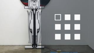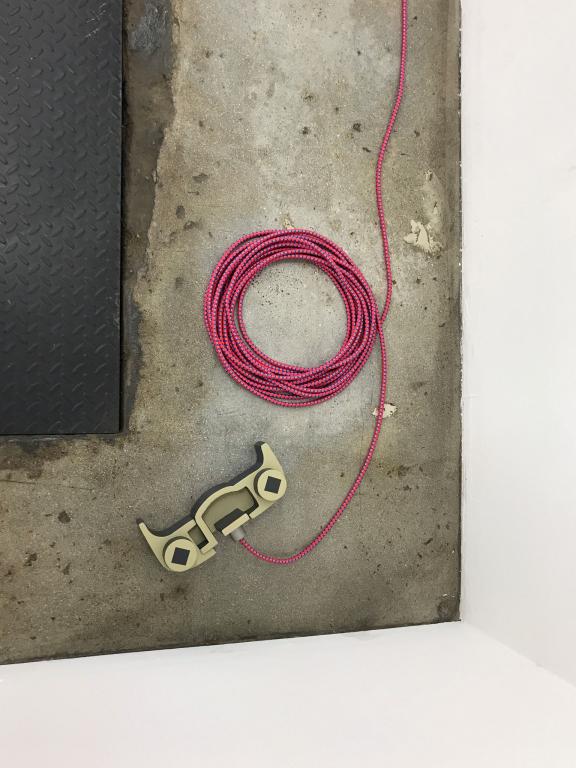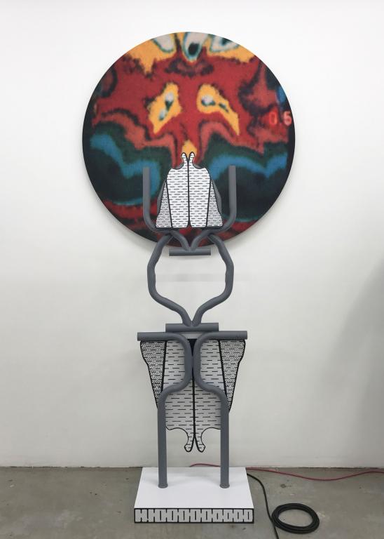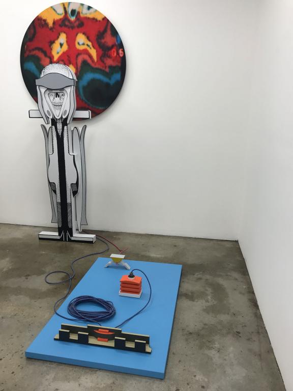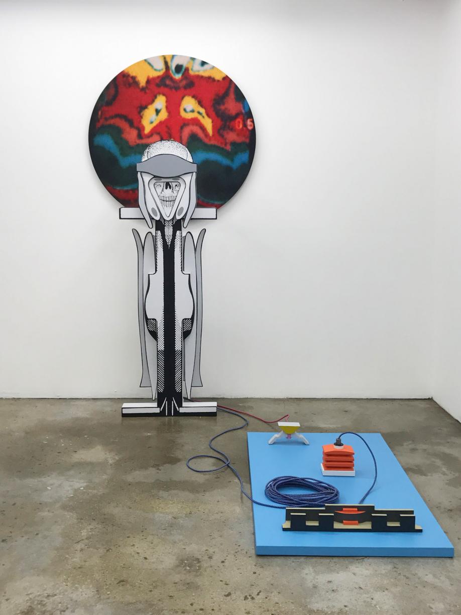 Gated Snare by Erik Frydenborg is a mash up between '80s graphics and '90s existential crisis in contrast with the shiny syntheticism of the cyber millennium. It’s difficult to dissect and specifically place in time the image references of the totems but they seem at once futuristic in a sci-fi retro kind of way while posing as some form of religious iconography. They’re linked by cables to objects on the ground that look like they could be accessories to musical equipment, game controllers, or forms of obsolete technology. Frydenborg’s works remind us how memories of visual languages of culture shift and distort over the decades, creating a sketchy and problematic composite of the past.